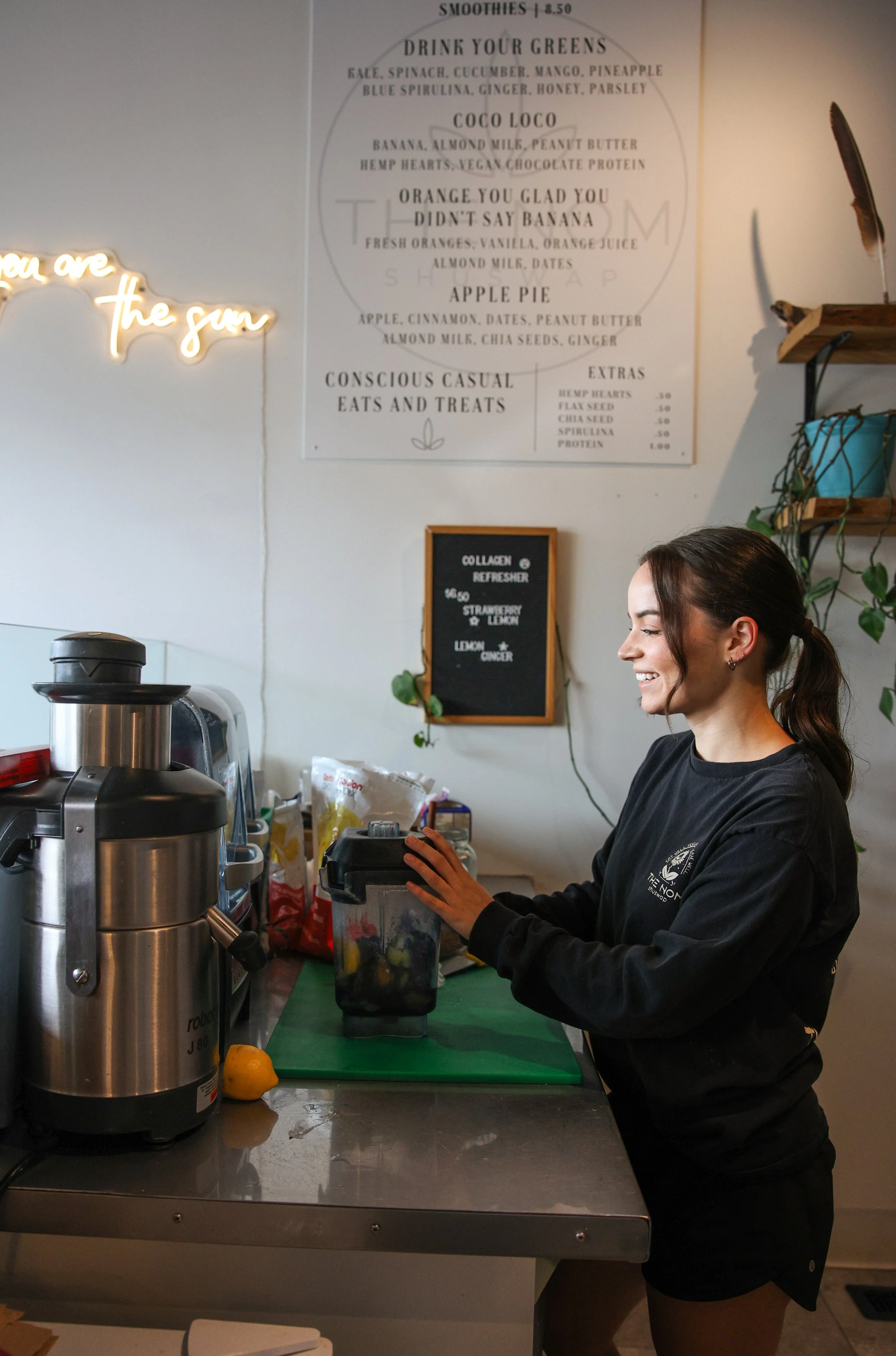 Everything at The Nom is made fresh each day and ready to grab when you walk in. Meals are clearly labeled with ingredients and pricing — no guesswork, no waiting. Smoothies are the only made-to-order item, and the selection changes throughout the day based on what’s fresh and in season.